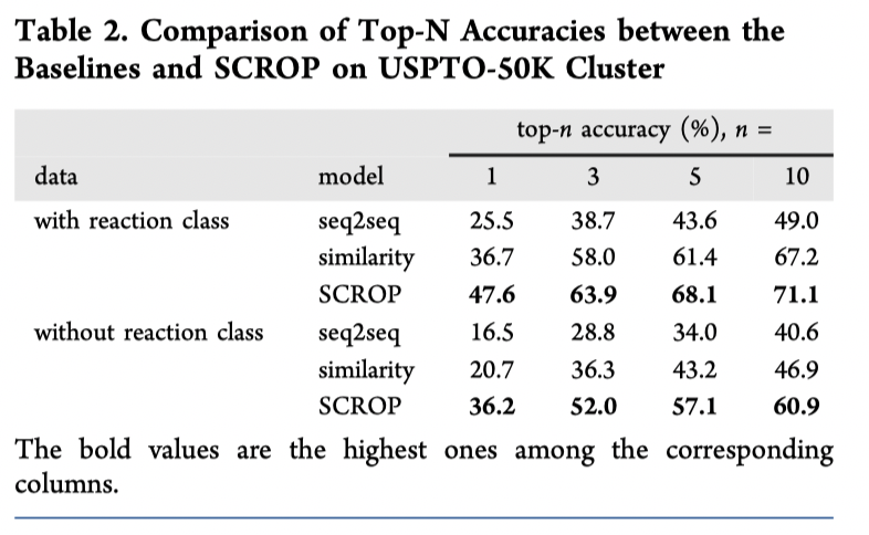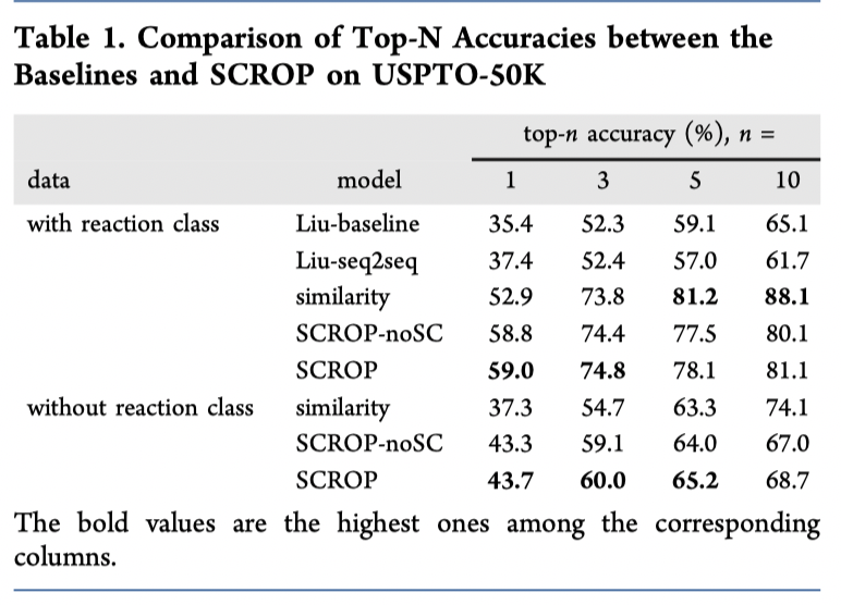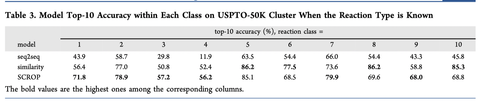 Coley 等人的基于模板(相似性)的模型,预测100 个候选化合物,并选出了前 10 名作为结果。 由于 SCROP 没有对候选化合物进行排名,而是经过训练以准确预测前 1 名的结果,并且只预测得出10个候选组合,因此基于相似性的方法具有更高的top-5和top-10准确率。 即便如此,SCROP 还是将基于相似性的方法在 top-1 准确度上提高了 6.1%。