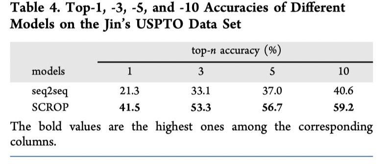 表 4 显示了与 Liu 等人的 seq2seq 模型在 Jin 的 USPTO 数据集上的比较。 分别达到了 41.5% 和 59.2% 的top-1和top-10准确率,SCROP 在更大的化学空间中优于最先进的无模板模型,证明了其可扩展性。