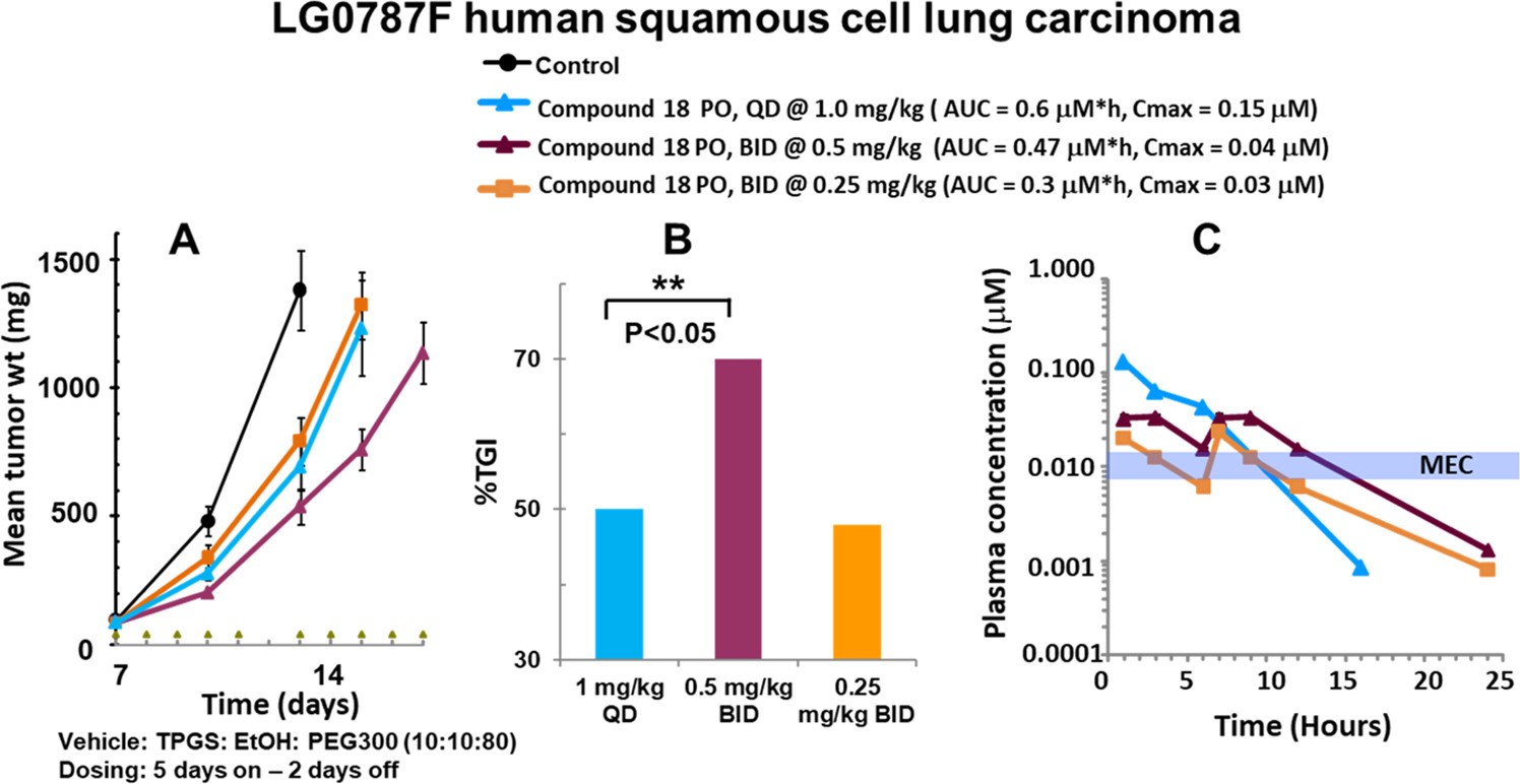 图5.在携带人肿瘤异种移植物的小鼠中口服 18 的抗肿瘤活性及其与血浆PK关系
