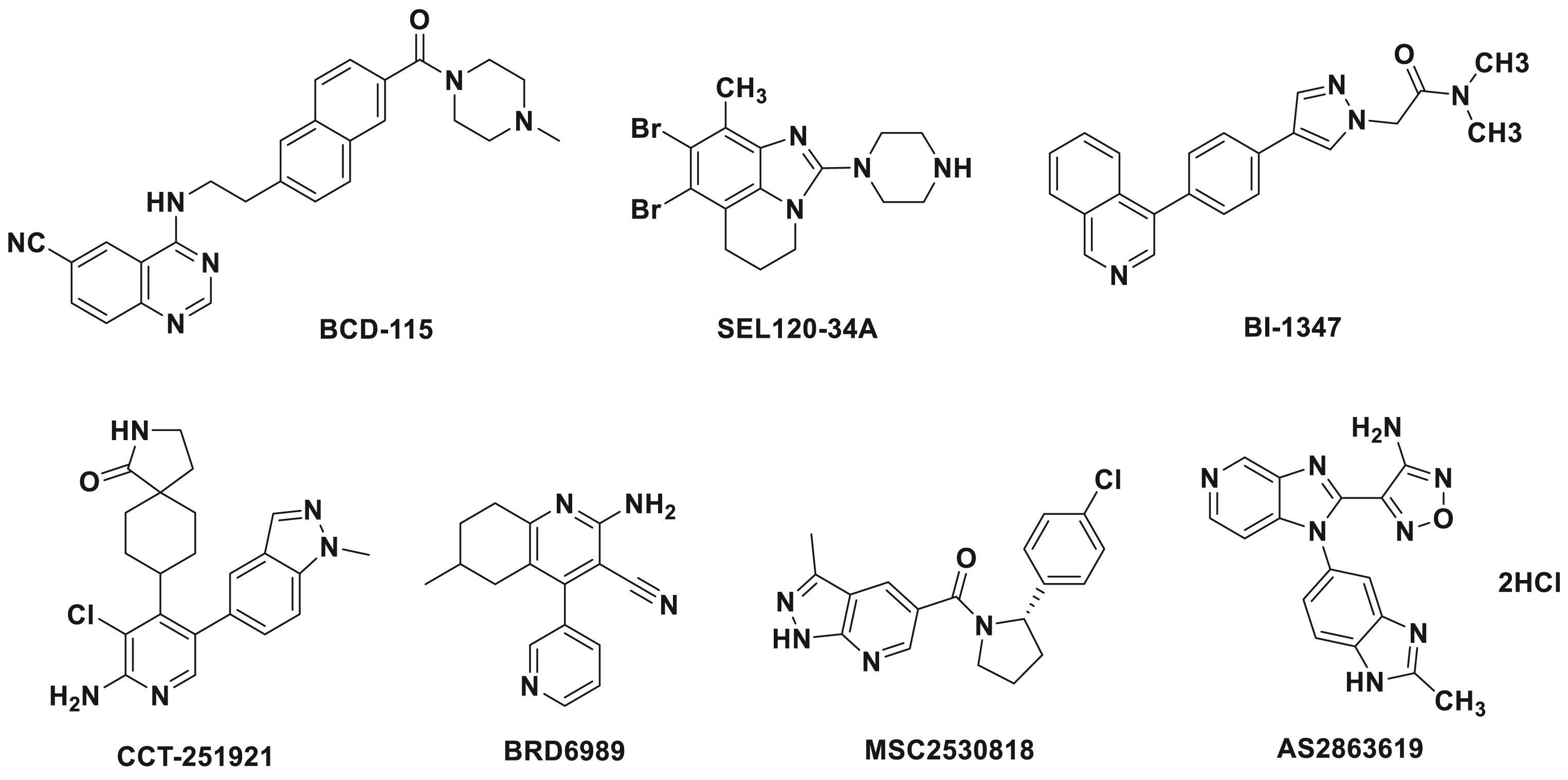 细胞周期蛋白依赖性激酶(Cyclin-Dependent Kinases, CDK)是丝氨酸/苏氨酸激酶家族的一员,在调节细胞周期进程和基因转录中发挥着关键作用。CDK 被认为是各种疾病的有前途的治疗靶点。目前已鉴定出多种CDK抑制剂,包括泛CDK抑制剂alvocidib (flavopiridol)和其他更具特异性的CDK抑制剂。CDK4/6选择性抑制剂palbociclib 、ribociclib和abemaciclib的发现是该靶点抑制剂研发的一大突破,不仅验证了CDK能够作为癌症的治疗靶点,而且强调了亚型选择性抑制剂在CDK抑制剂开发中的重要性。