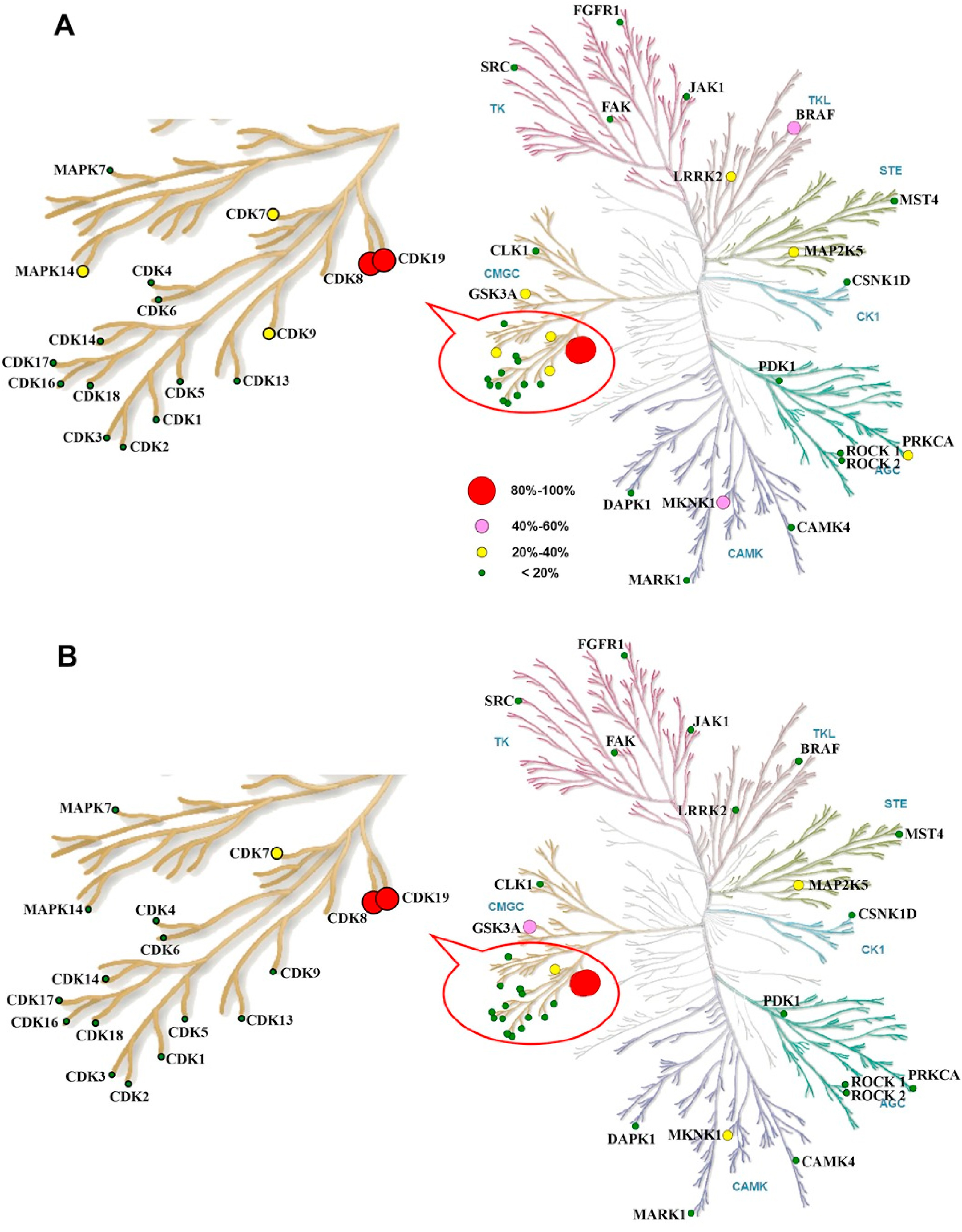 对化合物 4d和6n 的激酶分析进一步扩展到 36 种代表性激酶(包括 CDK19, CDK8 的旁系同源物)。如图3所示,这两种化合物对多种激酶没有表现出显着的抑制作用,而对CDK8 和CDK19 表现出明显的偏好。CDK19与CDK8高度同源,目前尚未获得能够区分CDK8和CDK19的选择性抑制,因此本文报道的CDK8抑制剂可能是CDK8/CDK19双重抑制剂。