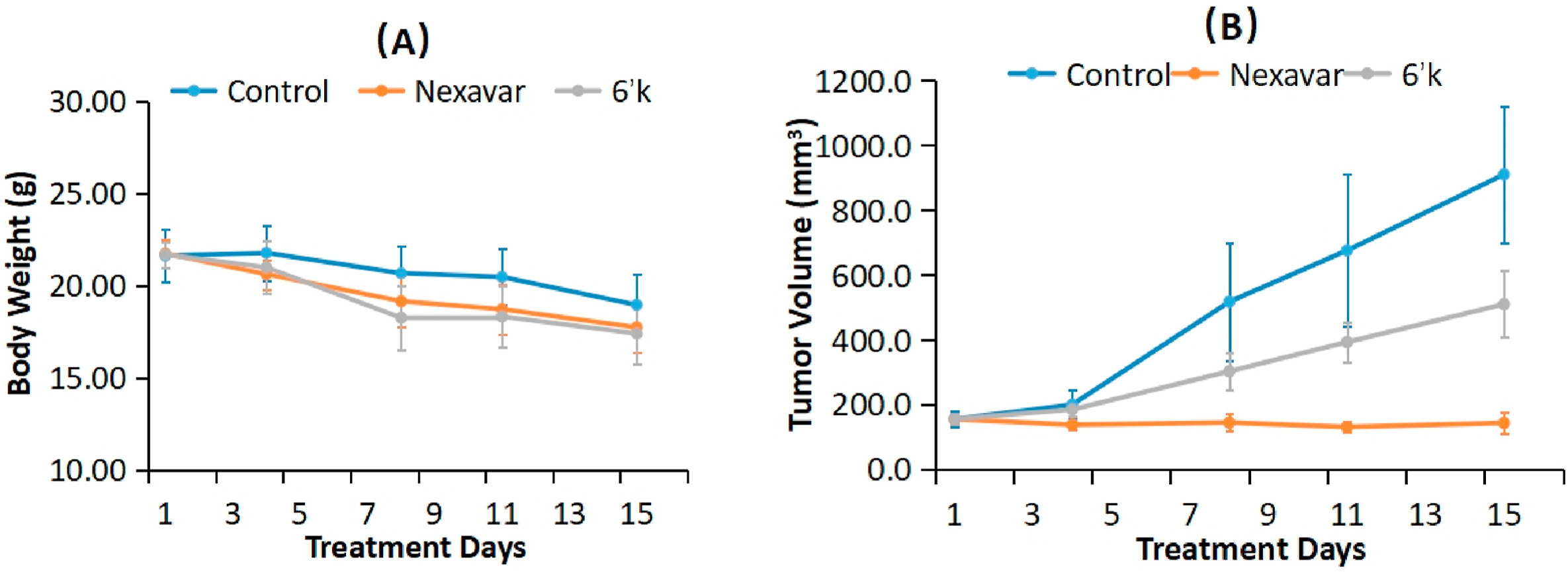 图4. 化合物6'k在 HCT-116 肿瘤异种移植模型中的体内抗肿瘤功效