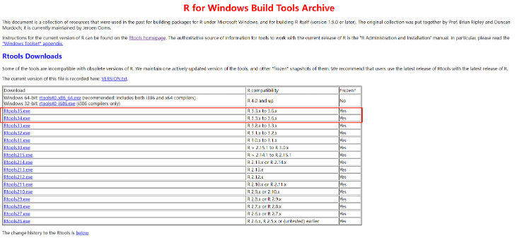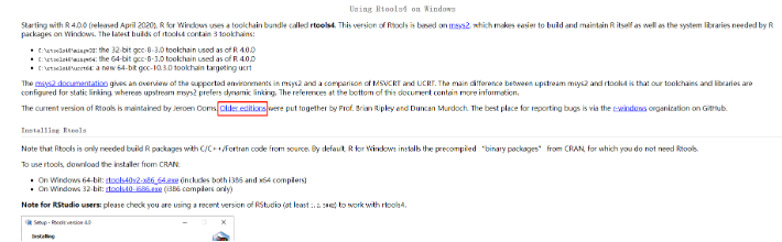 注意:该网站直接下载为Rtools4.0,本教程安装的是R3.6.1版本不能使用Rtools4.0,需要从Older editons进入,下载对应版本。