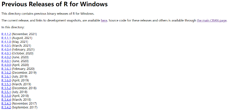目前R语言已经更新到4.0以上的版本了,不建议安装最新的版本,因为很多包在新版本中安装不了。(这其中的原因,以及安装哪一版本兼容的包比较多,准备在后续学习过程中进行一个比较)安装老版本进入这个地址:https://cran.r-project.org/bin/windows/base/old/