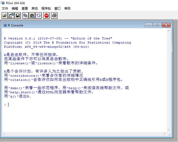 R安装后,这里安装的是R3.6.1,打开的界面如下。这里面可以直接写代码,写一行后,输入回车可以直接运行该行。为了更方便使用R语言,需要安装R studio。Rstudio是一个集成开发环境,使用Rstudio可以切换不同的R语言版本,设置背景颜色等等。如果把R比喻成相机,Rstudio就类似于相机的镜头,使相机更好的发挥作用。