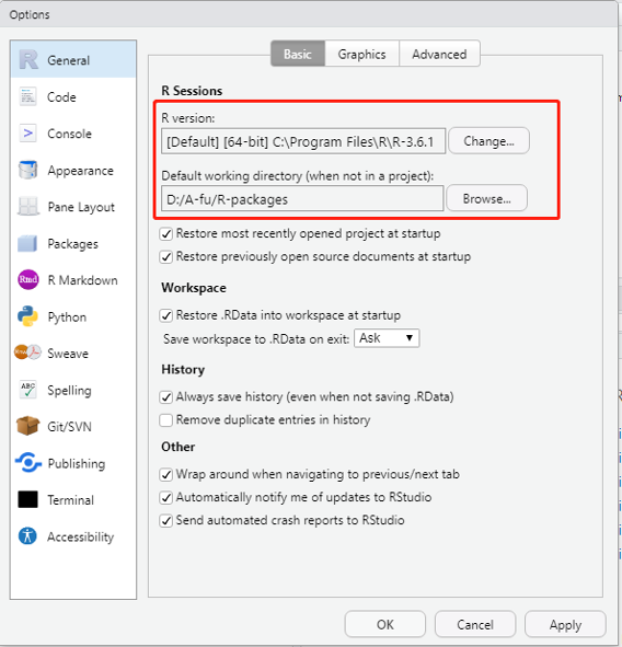 Tools > Global Option>General设置Rstudio对应的R语言版本,以及R包保存的位置。